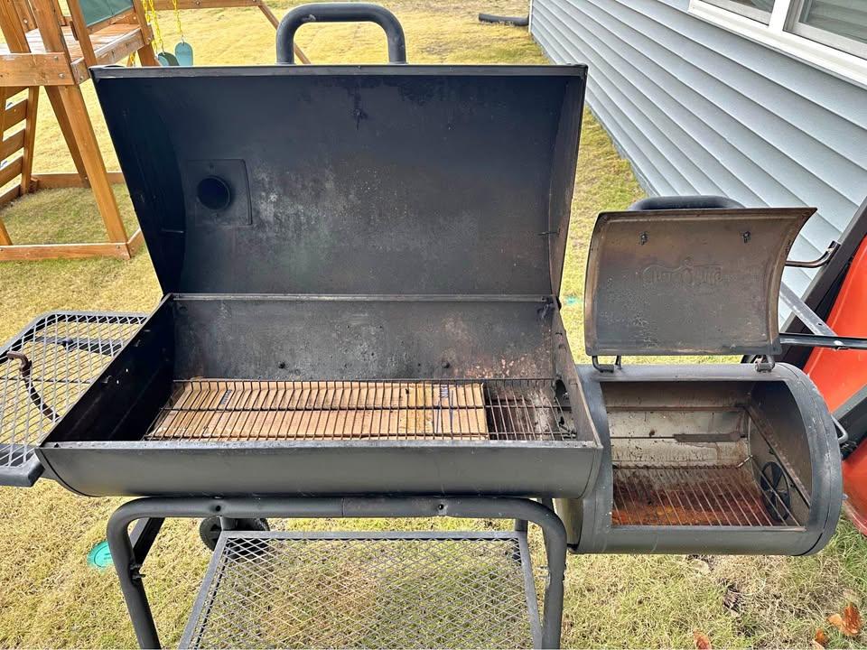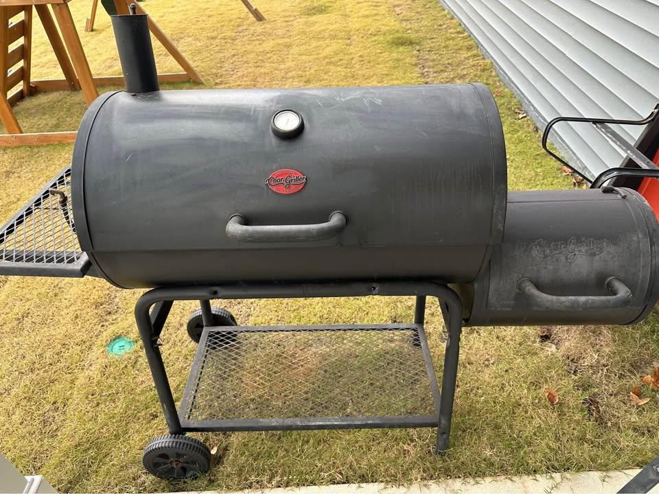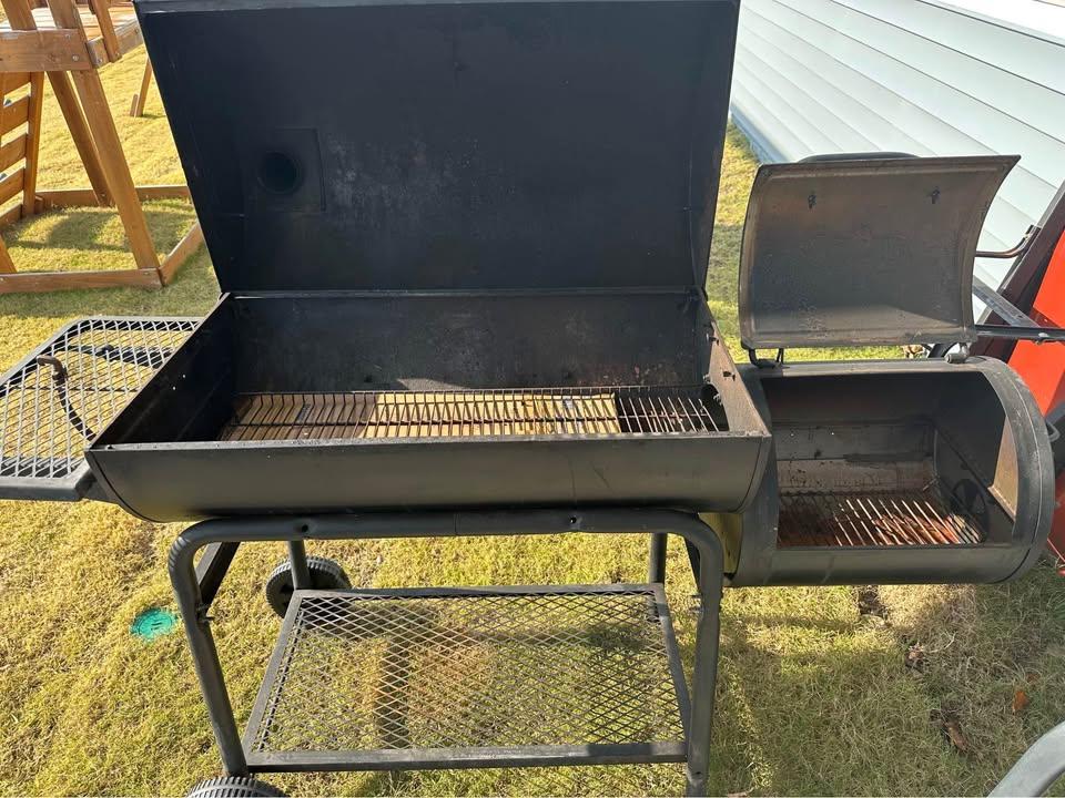 Charcoal grill and smoker combo. No longer using it and got a little banged up from the last move with the plastic wheels getting dented and moisture causing some rust. Just need a little TLC and new racks and should last for years more.